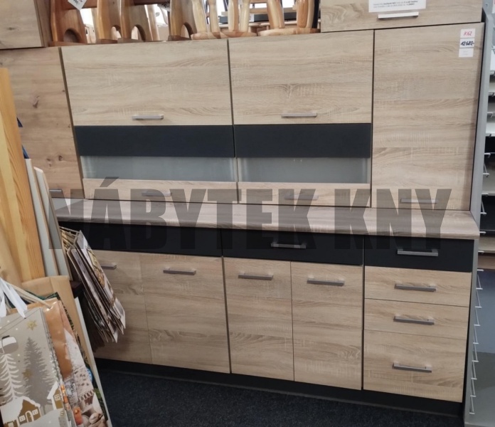 180cm + 60cm = 240cm, barva dub sonoma, dvířkovina MDF, frez f42, výška horních skříněk 72cm, výška psodních s deskou 85cm, v ceně je pracovní deska 180cm, v ceně není dřez, kuchyně je v demontu, v balíku, vyproadná, ale můžeme objednat