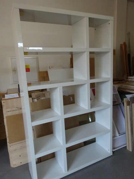 pevný stabilní, nadčasový regál s posuvnými dvířky, vysoký 221cm nabízí dostatek prostoru vhodný na knihy, přepaží místnost, zboží je ve II. jakost (chybí osvětlení) je v pořádku, dovoz Německo, původní cena 1.499 euro, prodáno