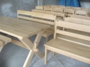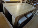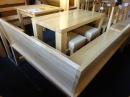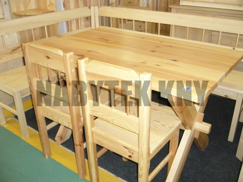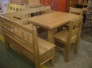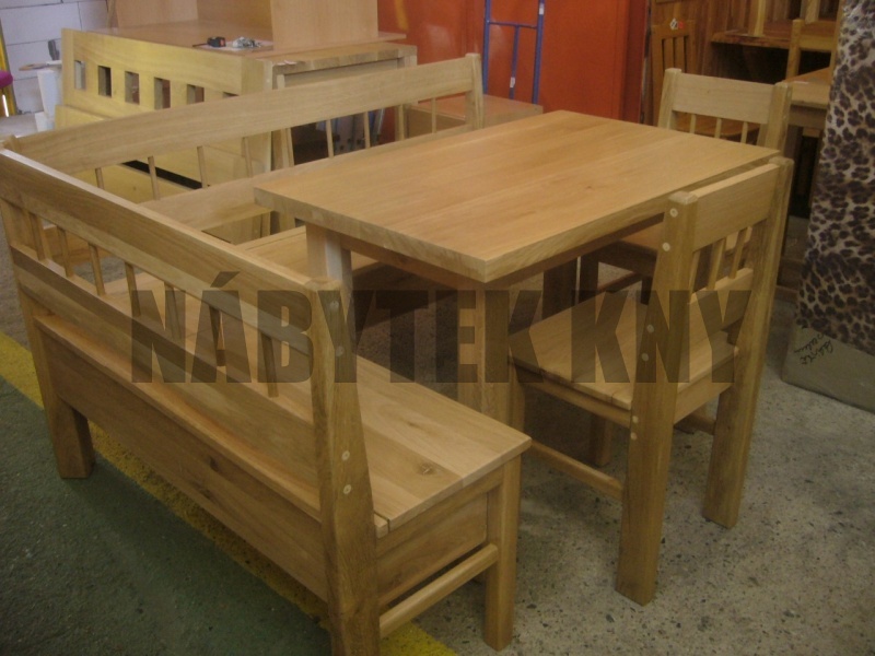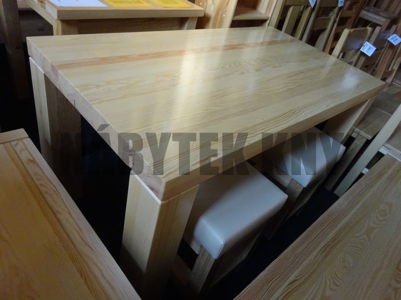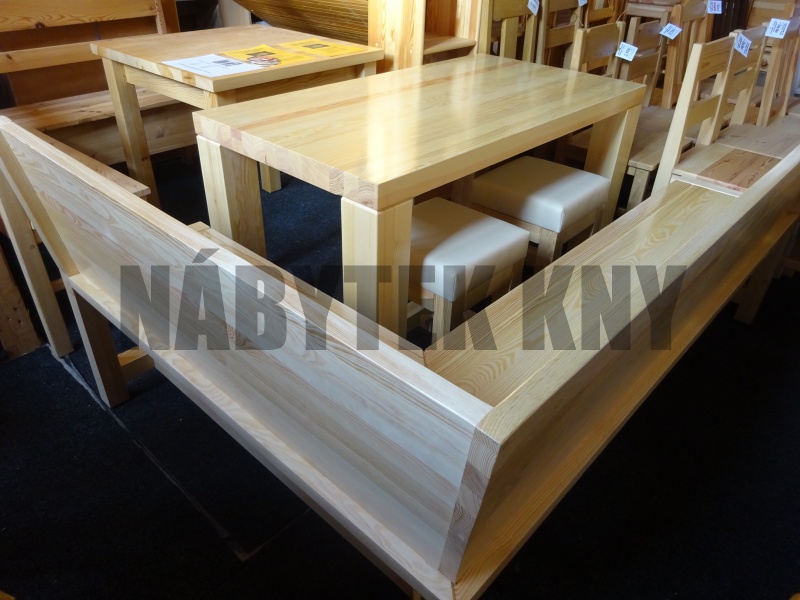 materiál výběrová borovice bez suků, lakovaná, rohová lavice tl. 3cm, noha 6x6cm, rozměry lavice: 195x135cm, stůl tl. 6cm noha 12x12cm, rozměry stolu 140x75cm, 2x taburet: 36x36x49cm, nedostupné
