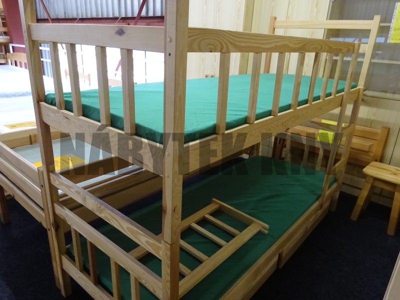 v ceně je palanda, 2 rošty, 2 matrace 190x80cm, 2 kontejnery pod postel (87x80cm), bezpečnostní zábrana výška 35cm, žebříček, materiál borovice, lakovaná, skladem ihned k odběru, dodáváme v rozloženém stavu, vejde se do osobního auta, vyprodaná