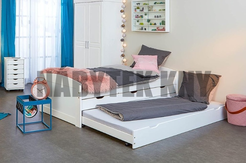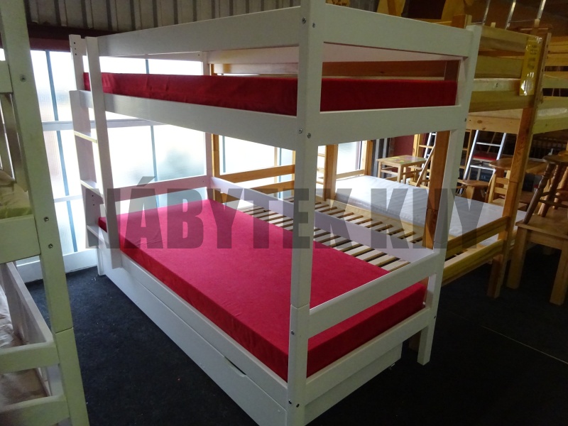 materiál borovice, lakovaná, v ceně nejsou rošty a není matrace, na matraci 200x90cm, cena roštu 750Kč, mezera 80cm, dole mezera na šuplík 25cm, dodáváme v demontu, snadný odvoz, skladem