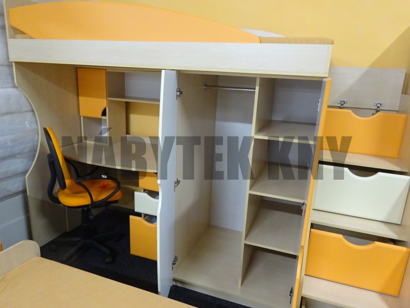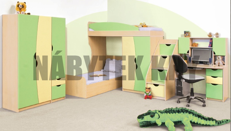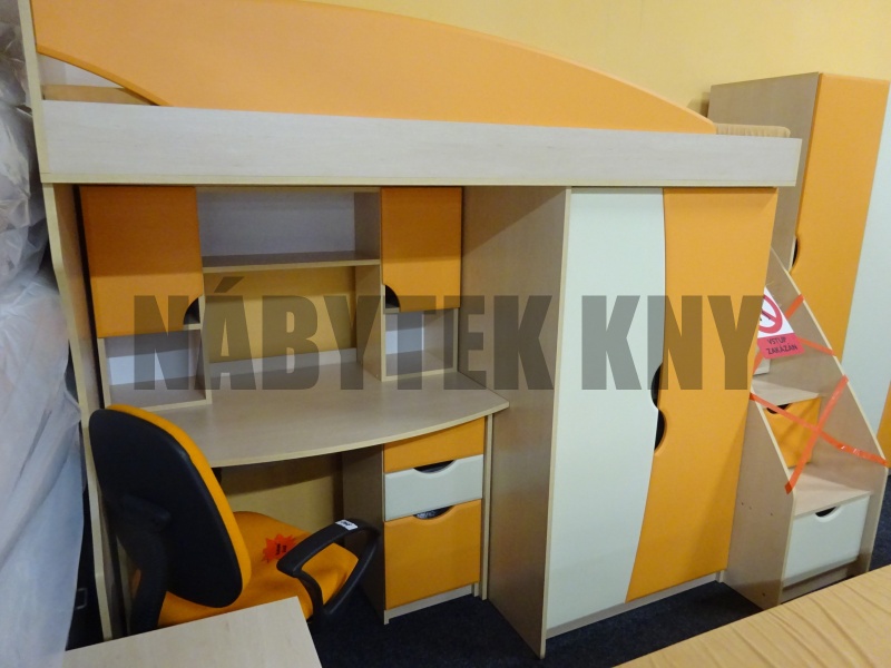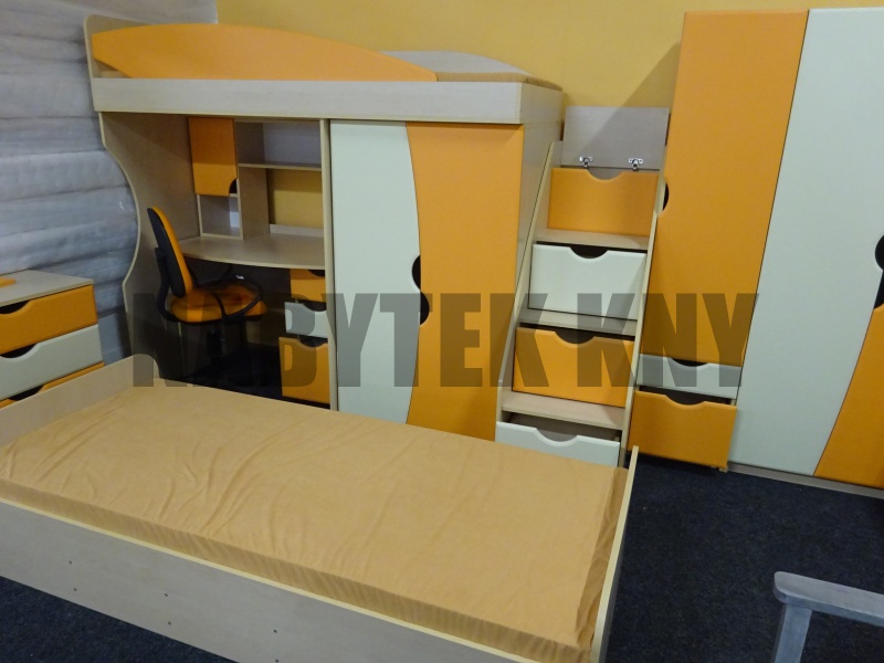 v ceně je skříň 2D, skříň 1DV, komoda, PC stůl, kontejner, nástvaba na PC, vysoká postel bez matrace, se skříň v posteli, schody, v ceně není matrace a židle, prodáváme jako komplet
