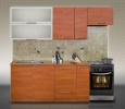 barva kalwados, hrany ABS, délka 180cm + 60cm dig.skříňka = 240cm, výška horních skříněk 72cm, výška spodních skříněk 85cm, v ceně je prac. desk a180cm, v ceně není dřez a spotřebiče, kuchyně je v demontu, nedostupná