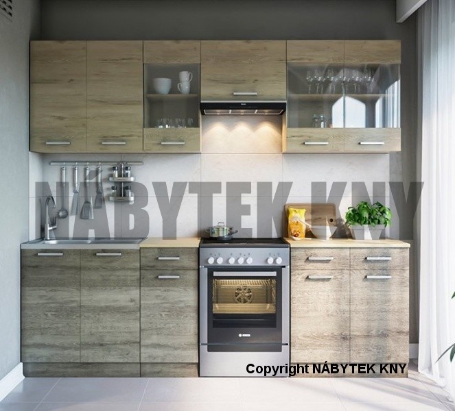 barva dub sonoma/trufel, horní 80+40sklo+60+60 sklo, dole 80+40š+60š, v ceně je pracovní deska 180cm vkuse, kuchyně je v demontu, vyprodaná