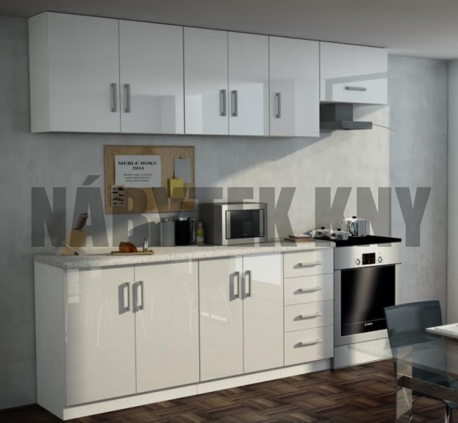 barva bílá, vysoký lesk, délka 180cm + 60cm dig.skříňka = 240cm, výška horních skříněk 72cm, výška spodních 85cm, v ceně je pracovní deska 180cm vkuse, v ceně není dřez a spotřebiče, skladem IHNED K ODBĚRU