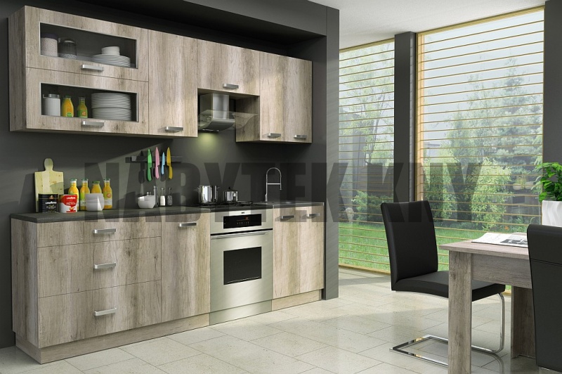 moderní kuchyně má zásuvky s kuličkovým plnovýsuvem, dotahem a tlumením, horní výkopy s plynovými písty, výška hor.sřkíněk 72cm, výška spodních s deskou 85cm, v ceně je deska 180cm vkuse, v ceně není dřez a spotřebiče, kuchyně je v balíku, skladem ihned k odběru, ke kuchyni jdou dobjednat skříňky