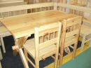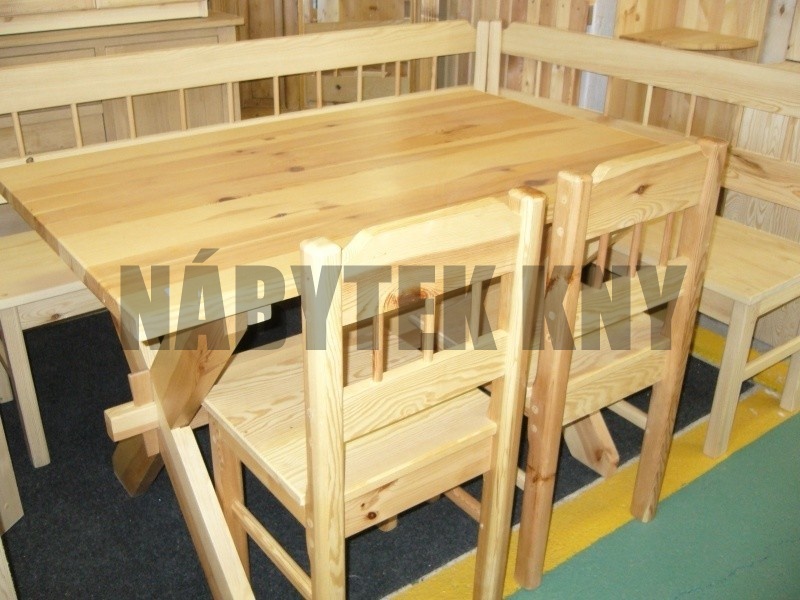 materiál borovice, lakovaná, vlastní výroba, dodáváme v sestaveném stavu, napřání vyrobíme jakýkoliv rozměr, stůl 140x80cm cena 7.980Kč, židle cena kus 1.750Kč, lavice 200x140cm cena 9.400Kč + žbrdlinky 1.000Kč