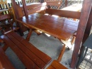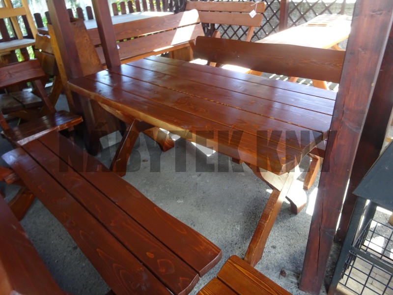 ořech matný, tl. 4cm, v ceně setu: stůl 150x65x72cm, 2x lavice 150x58x83cm, 2x křesílko 49x58x83cm, skladem