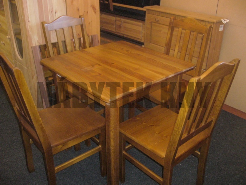 materiál borovice, odstín dub, stůl 75x75cm cena 2.490Kč, židle barevná šroubovaná cena kus 1.785Kč