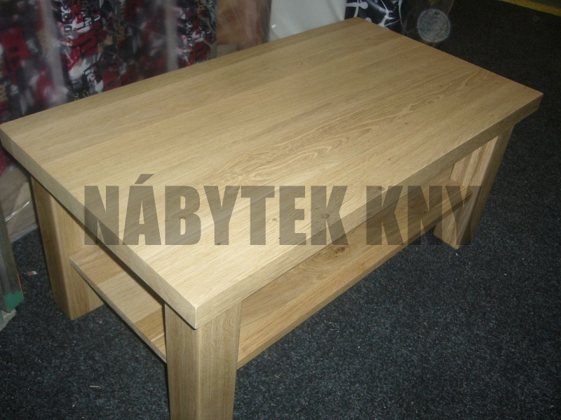 materiál dub, lakovaný, s policí, horní deska tl. 4cm, noha 8x8cm, vlastní výroba, dodáváme v sestaveném stavu, na přání vyrobíme jakýkoliv rozměr