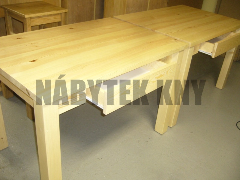 materiál borovice, lakovaná, šuplík 60cm, tl. horní desky 4cm, noha 8x8cm, vlastní výroba, na přání vyrobíme jakýkoliv rozměr