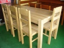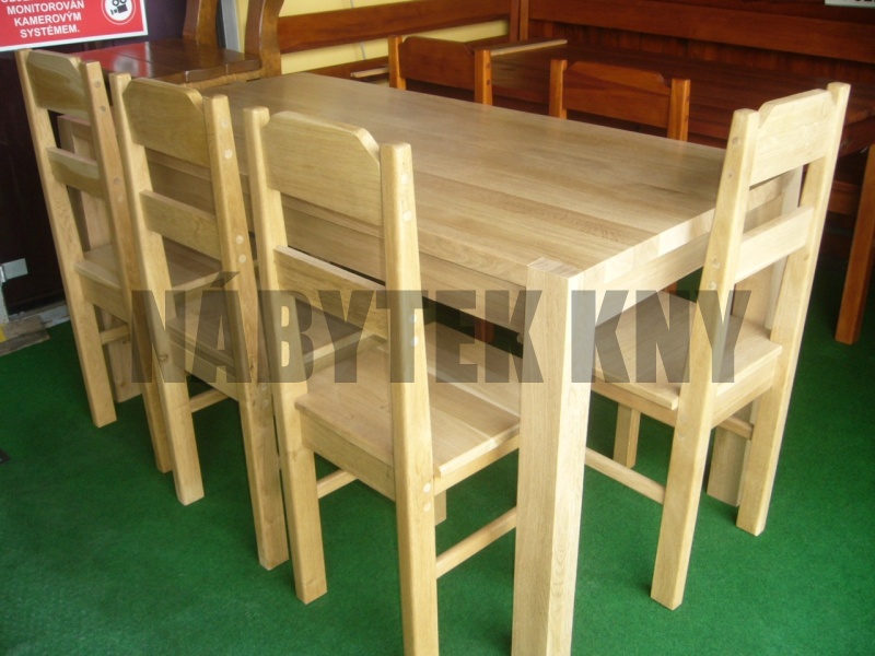 materiál dub, lakovaný, tl. 4cm, nohy 8x8cm, stůl vložený nohy 200x90cm cena 14.680Kč, židle cena kus 3.650Kč, vlastní výroba, můžeme vyrobit jakýkoliv rozměr a množství