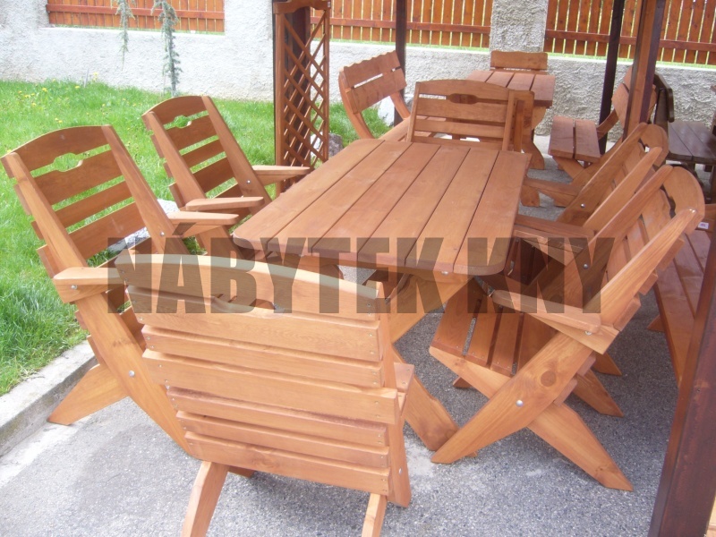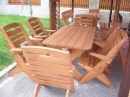 naše nejprodávanější sezení, skladné/sklopné, nezabere místo, materiál masiv, povrchová úprava lazura teak, v ceně je stůl 140x67x75cm, 6xkřeslo 50x80x60cm, skladem