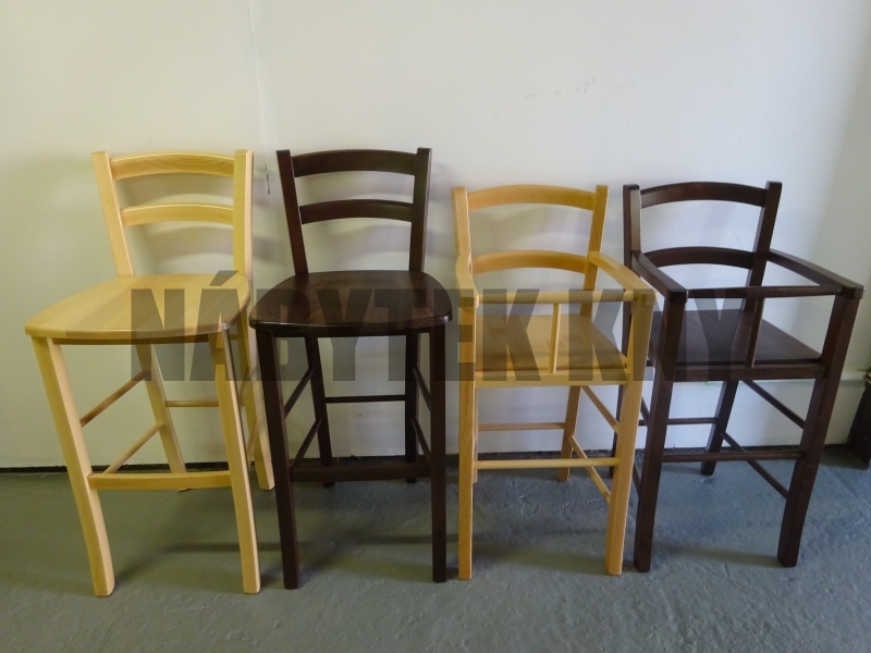 materiál buk, odstín buk nebo ořech, židle barová cena kus 2.280Kč, výška sedu 72cm, vhodné do provozu, nosnost do 150kg, doprodej