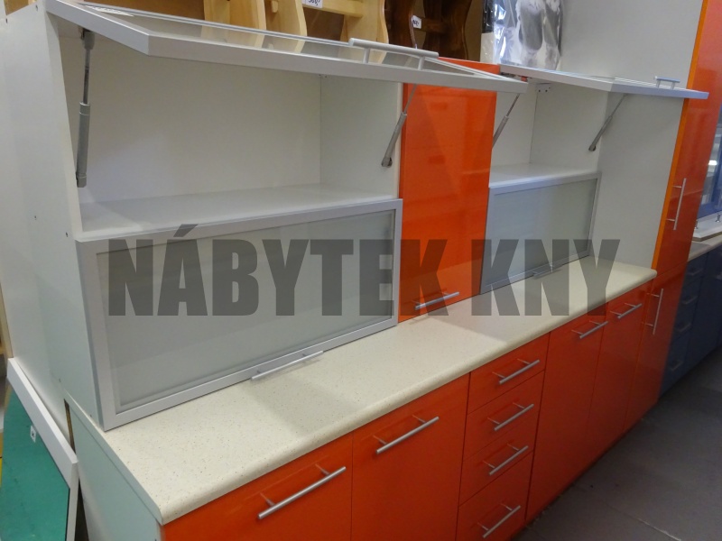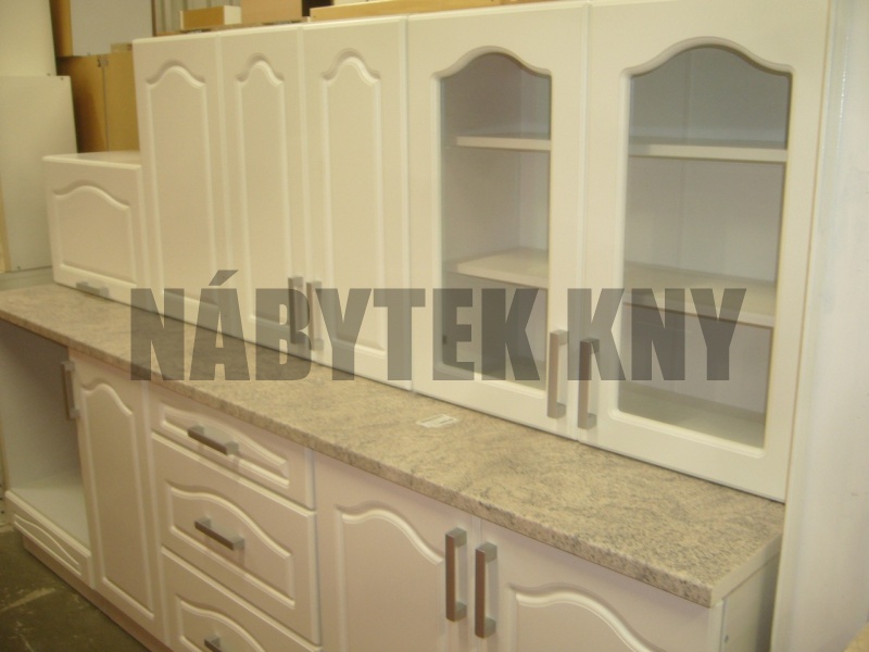240cm, barva bílá, dvířkovina MDF, frez F32, v ceně není pracovní deska 240cm, kuchyně obsahuje dole: 80dřezová, 60 šuplíky, 40 dolní a 60 sporáková, nahoře: 80 sklo, 60 horní, 40 horní, 60 digestořová, vyprodaná, jen na objednání
