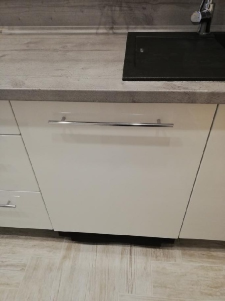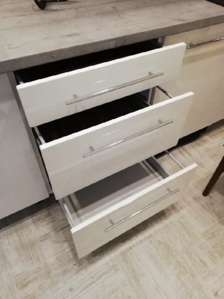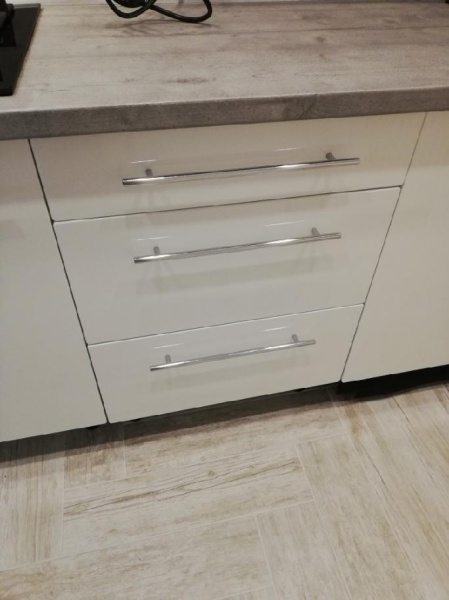 detail na kuchyň MDF bílá, korpus bílý a kovové uchytky, ceník jednotlivých skříněk zašleme