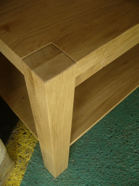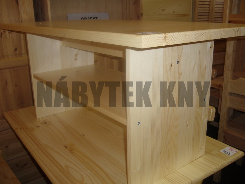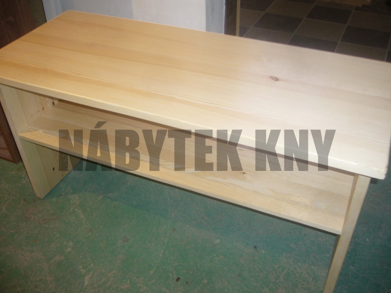 materiál dub, lakovaný, s policí, horní deska tl. 4cm, noha 8x8cm, vlastní výroba, dodáváme v sestaveném stavu, na přání vyrobíme jakýkoliv rozměr
