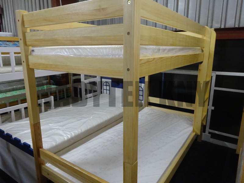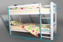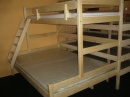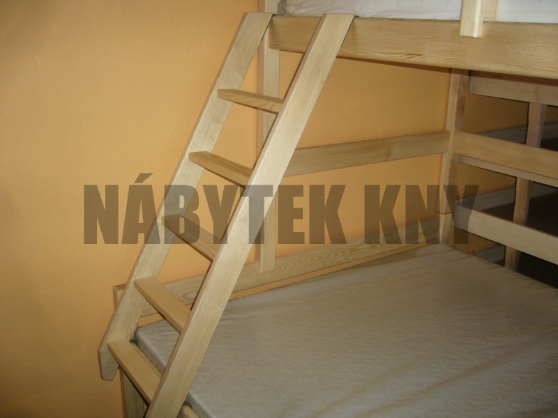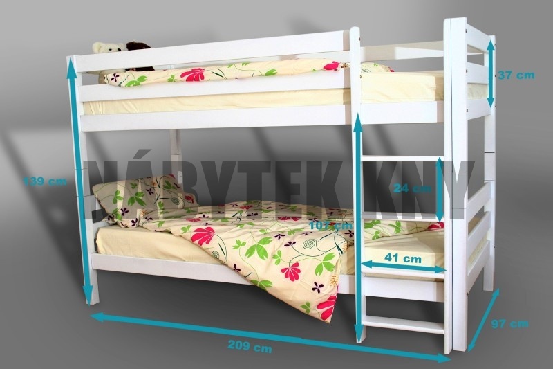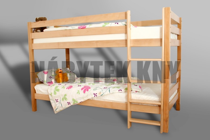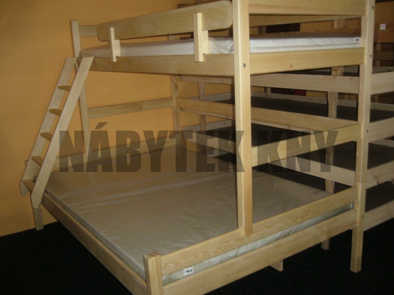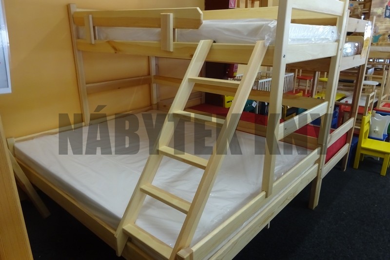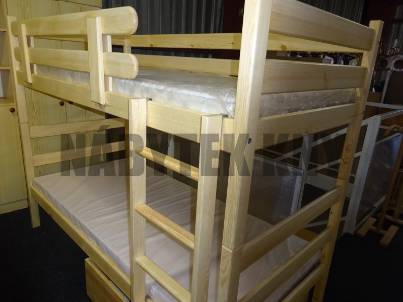 materiál borovice, povrchová úprava vodou ředitelný lak, spoje čep, rozměry horní lůžko: 200x90cm, dolní lůžko: 200x140cm, mezera při matrace 10cm je 82cm, v ceně jsou rošty, v ceně nejsou matrace, vlastní výroba, na přání výrobíme jakýkoliv rozměr