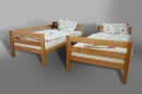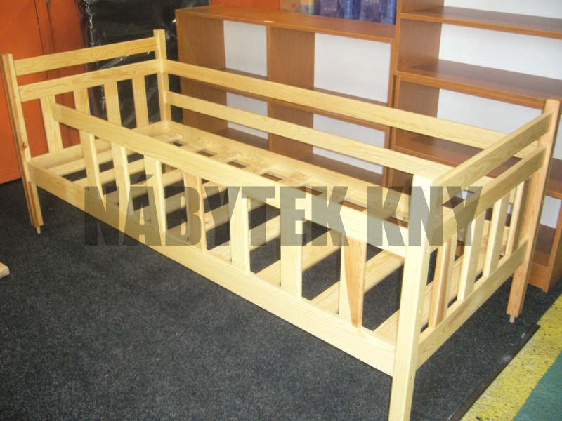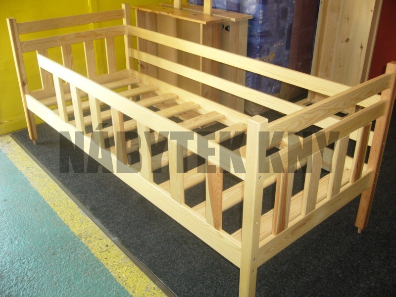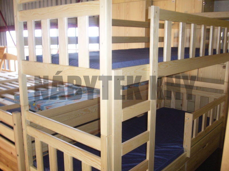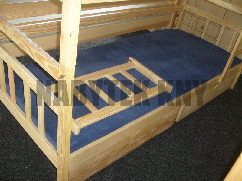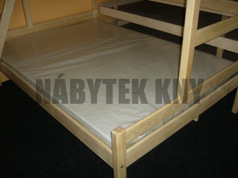 vyšší dvojitá zábrana, materiál borovice, spoje čep, povrchová úprava vodou ředitelný lak, v ceně je rošt, v ceně není matrace (90x200cm), vlastní výroba - na přání vyrobíme i jiný rozměr