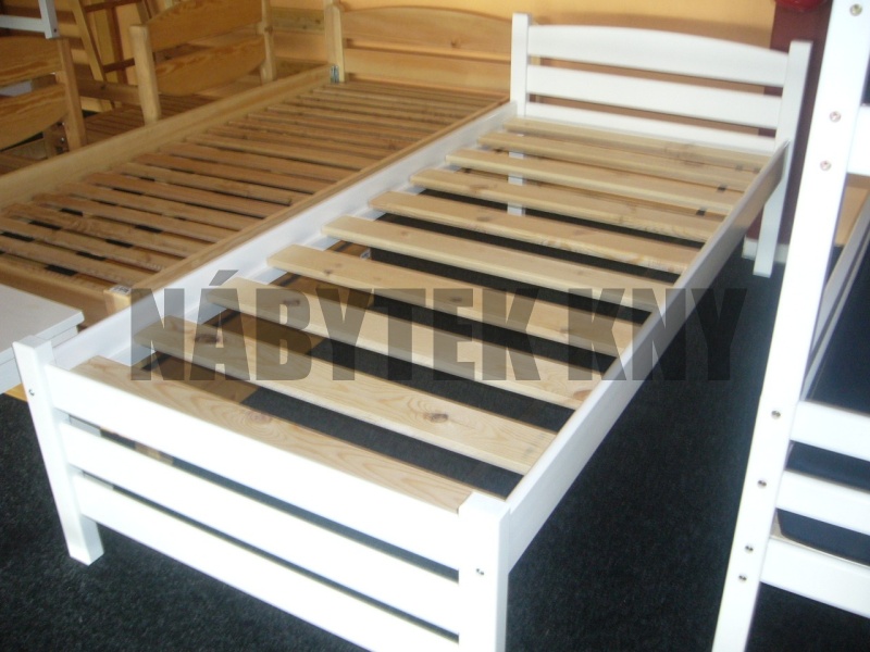 materiál borovice, povrchová úprava vodou ředitelný lak, spoje čepy, skladem v rozloženém stavu, v ceně je rošt, v ceně není matrace (90x200cm), vlastní výroba - na přání vyrobíme i jiný rozměr, skladem ihned k odběru