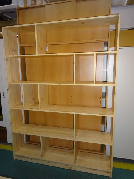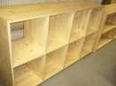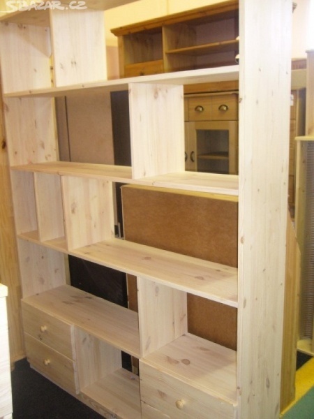 regál je oboustraný může sloužit jako dělící stěna, materiál borovice, lakovaná, vlastní výroba, dodáváme ve smontovaném stavu, můžeme vyrobit jakýkoliv rozměr