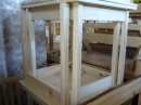materiál borovice, lakovaná, síla horní desky tl. 25mm, noha 6x6cm, vlastní výroba, můžeme vyrobit jakýkoliv rozměr a množství