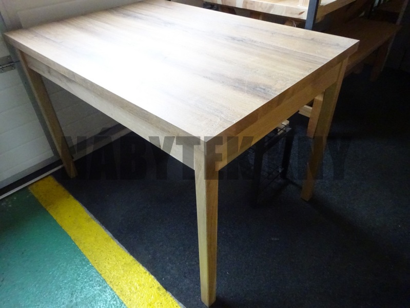 materiál borovice, lakovaná, odstín dub a olše, kulatý rohy, noha 6x6cm, tl. 2cm, výška stolu 75cm, skladem ihned k odběru, demont, možno objednat jakýkoliv množství