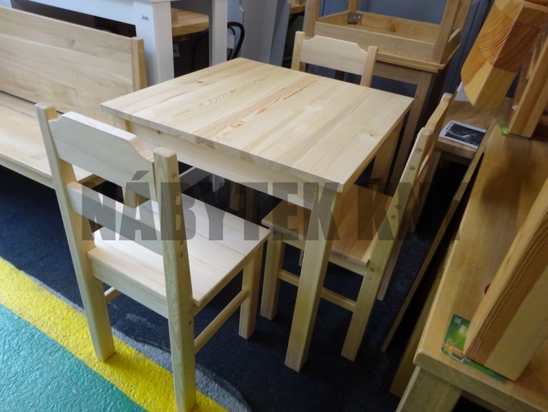 materiál borovice, lakovaná, tl. 4cm, noha 6x6cm, výška stolu 75cm, lub 8cm, mezera pod stolem 62cm, demont, skladem