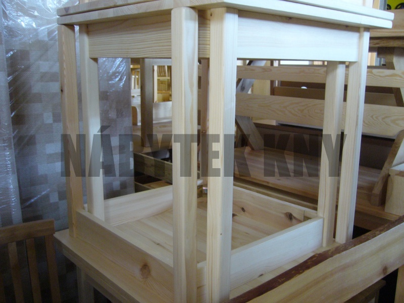 materiál borovice, lakovaná, síla horní desky tl. 25mm, noha 6x6cm, vlastní výroba, na přání vyrobíme jakýkoliv rozměr