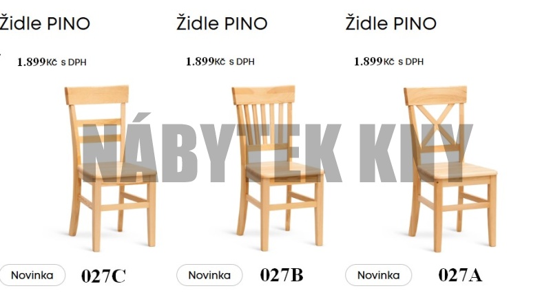 zprava židle z borovice cena kus 1.980Kč, dub cena kus 3.290Kč, olše cena kus 2.890Kč