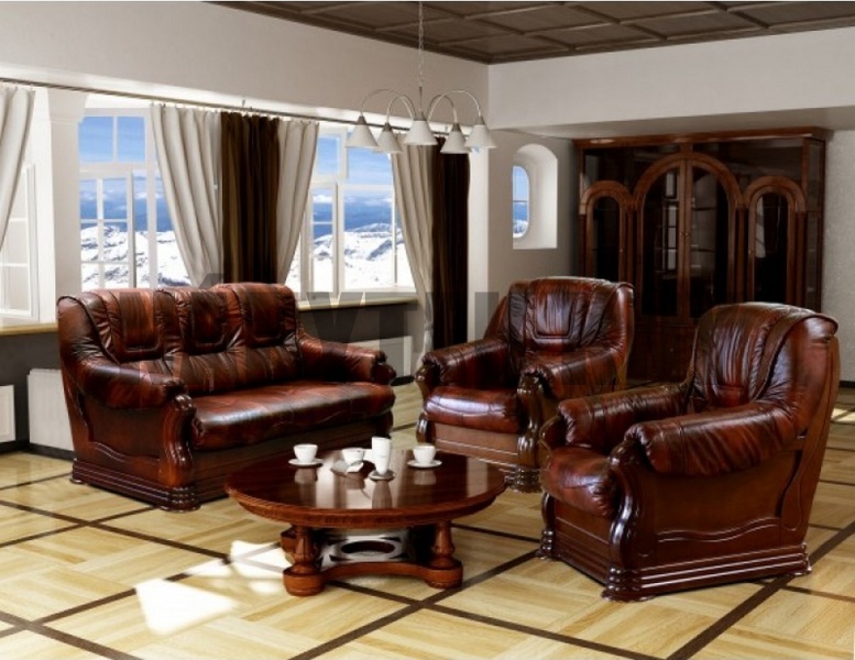 kožená sedačka, sedačka má masivní dřevěné zdobení, v ceně jsou 2 křesla a sedačka je rozkládací, rozměry lůžka: 192x140cm, na objednání