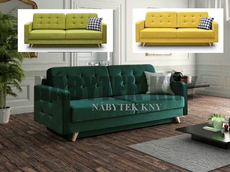 retro model, rozkládací pohovka s úložným prostorem, nohy masiv, rozměry sedačky: 229x97x95cm, spací plocha: 200x140cm, 5 barev: yelow, orange, grey, green a blue, SKLADEM sv.modrá