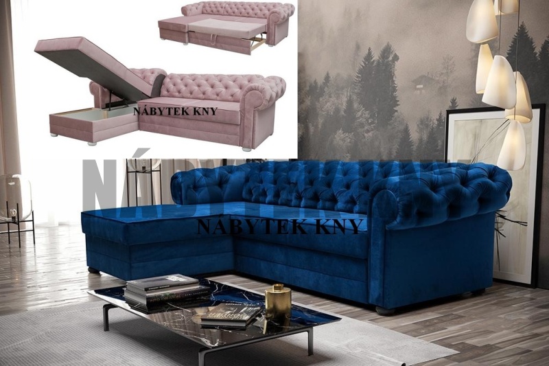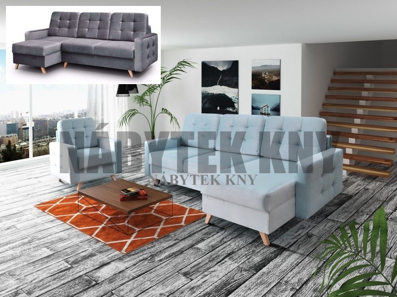retro model, rozkládací pohovka s úložným prostorem a křeslo, nohy masiv, rozměry: 236x151x95cm, spací plocha: 206x146cm, na objednání 3 barvy. modrá, zelená a šedivá