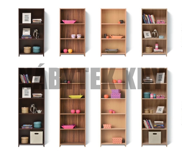 mix nových regálu, barvy bílá, dub sonoma, buk, olše, calvados, dub artisan, široký výběr nových regálů na prodejně