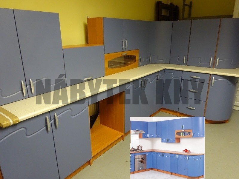 skulatým zakončením, celková delka skříněk 470cm, jednotlivé skříňky jde libovolně kombinovat, v ceně není pracovní deska, kuchyni dodáváme v sestaveném stavu, kuchyni máme skladem ihned k odběru, montáž u nás na dílně nám trvá 1-2dny, PRODÁNO