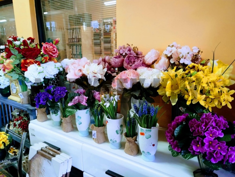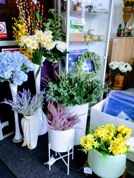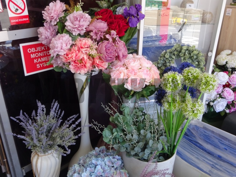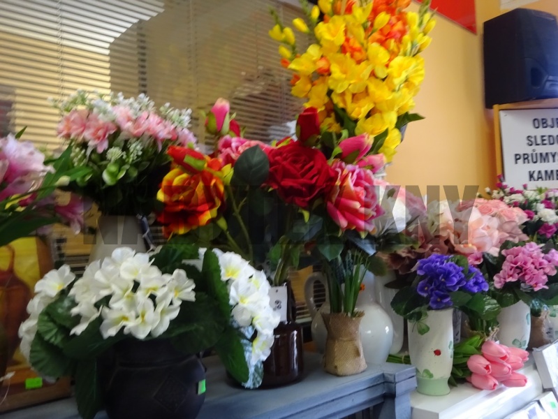 na prodejně, najdete široký výběr, umělých květin, rostlin, puketů, i jednotlivých květin