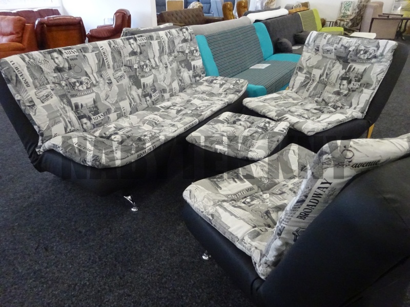 pohovka cena 9.850Kč, křeslo cena 5.190Kč, pufa cena 2.190Kč, látka nedostupná