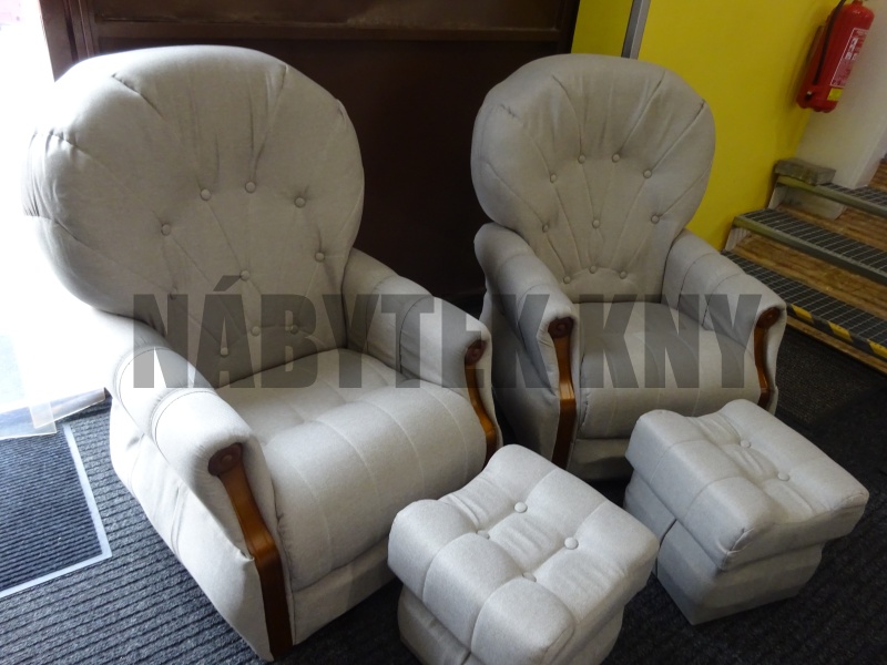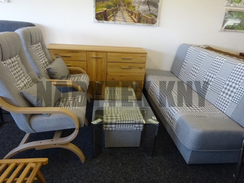 rozkládací sedačka s uložný prostorem, 2 pohodlná relaxační pohupovací křesla, 2pufy, výška sedu 42cm, rozměry sedačky: 185x85x90cm, rozměry lůžka: 185x108cm, křeslo: 65x100x85cm, pufa: 38x38cm