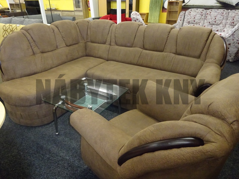 rozkládací roh s úložným prostorem, v ceně je křeslo: 80x87x105cm, rozměry pohovky: 250x105x180cm, rozměry lůžka: 195x125cm, sedačka je celočalouněná, vhodná do prostoru, zdobení masiv, látka elefant, prodaná