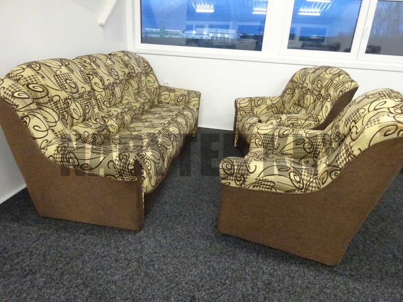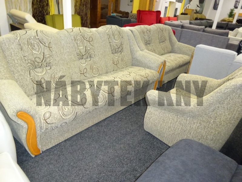 3+2+křeslo, celočalouněná, sedačka vhodná do prostoru, ozdoba masiv, trojsedák rozkládací 220x90x95cm, dvojsedák 150x90x95cm, křeslo 87x90x95cm, plocha na spaní 185x120cm, prodáno
