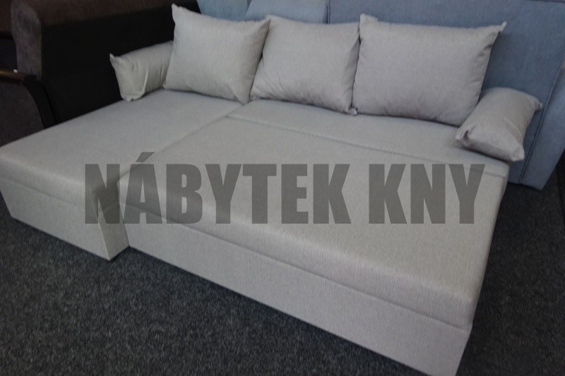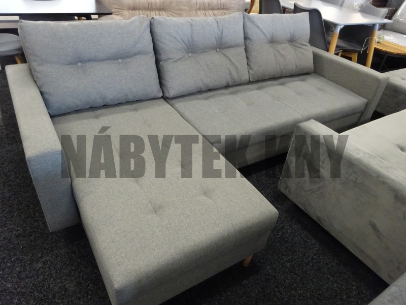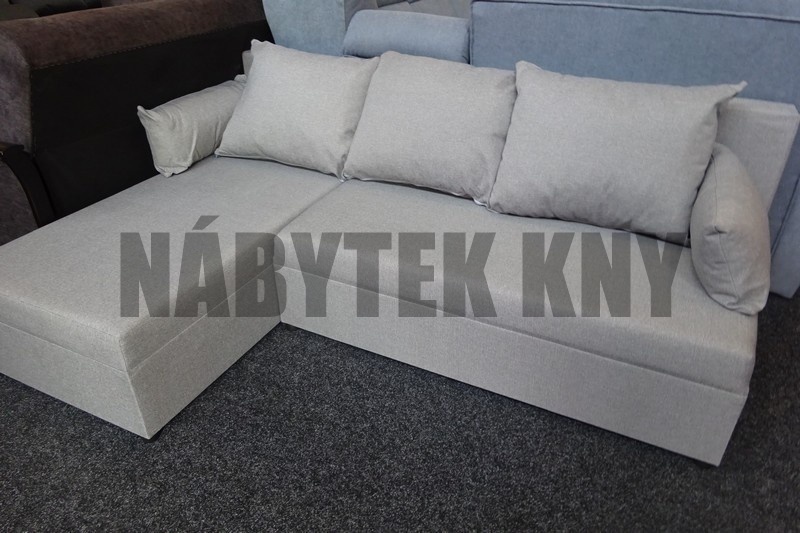 jednoduchá sedačka na masivních nožkách s polštáři, rozkládací roh s uložným prostorem, univerzální, rozměry sedačky: 230x146x95cm, výška sedačky 78cm, výška sedu 37cm, barva šedá