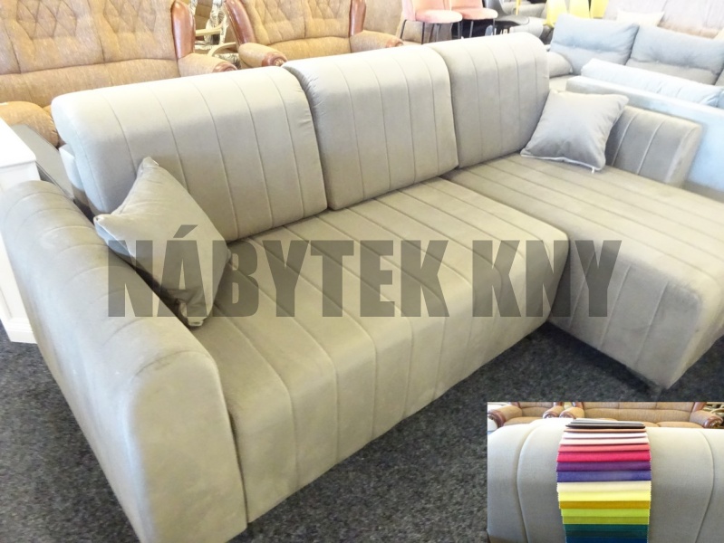 rozkládací s úložným prostorem, štelovací podhlavníky 78-96cm, rozměry sedačky: 275x173x96cm, plocha na spaní: 200x130cm, není univerzální, možno objednat i v jiných barvách, látka POSO