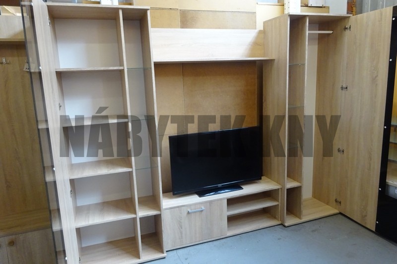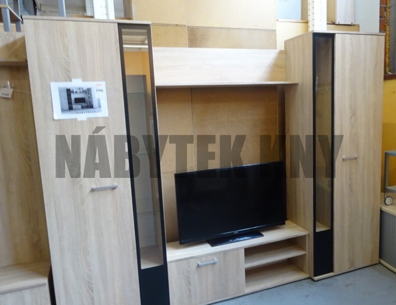 zboží je ve II. jakosti, dovoz Německo, obýváková stěna dub, 4v1, součástí je TV stolek, police, knihovna sklo, komoda sklo