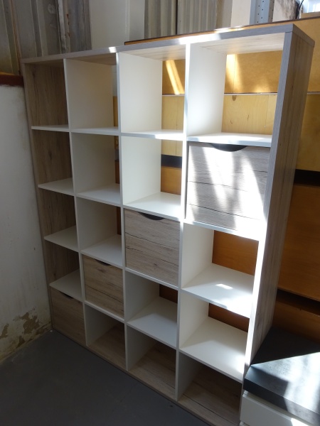 pevný stabilní, nadčasový regál s posuvnými dvířky, vysoký 221cm nabízí dostatek prostoru vhodný na knihy, přepaží místnost, zboží je ve II. jakost (chybí osvětlení) je v pořádku, dovoz Německo, původní cena 1.499 euro, prodáno